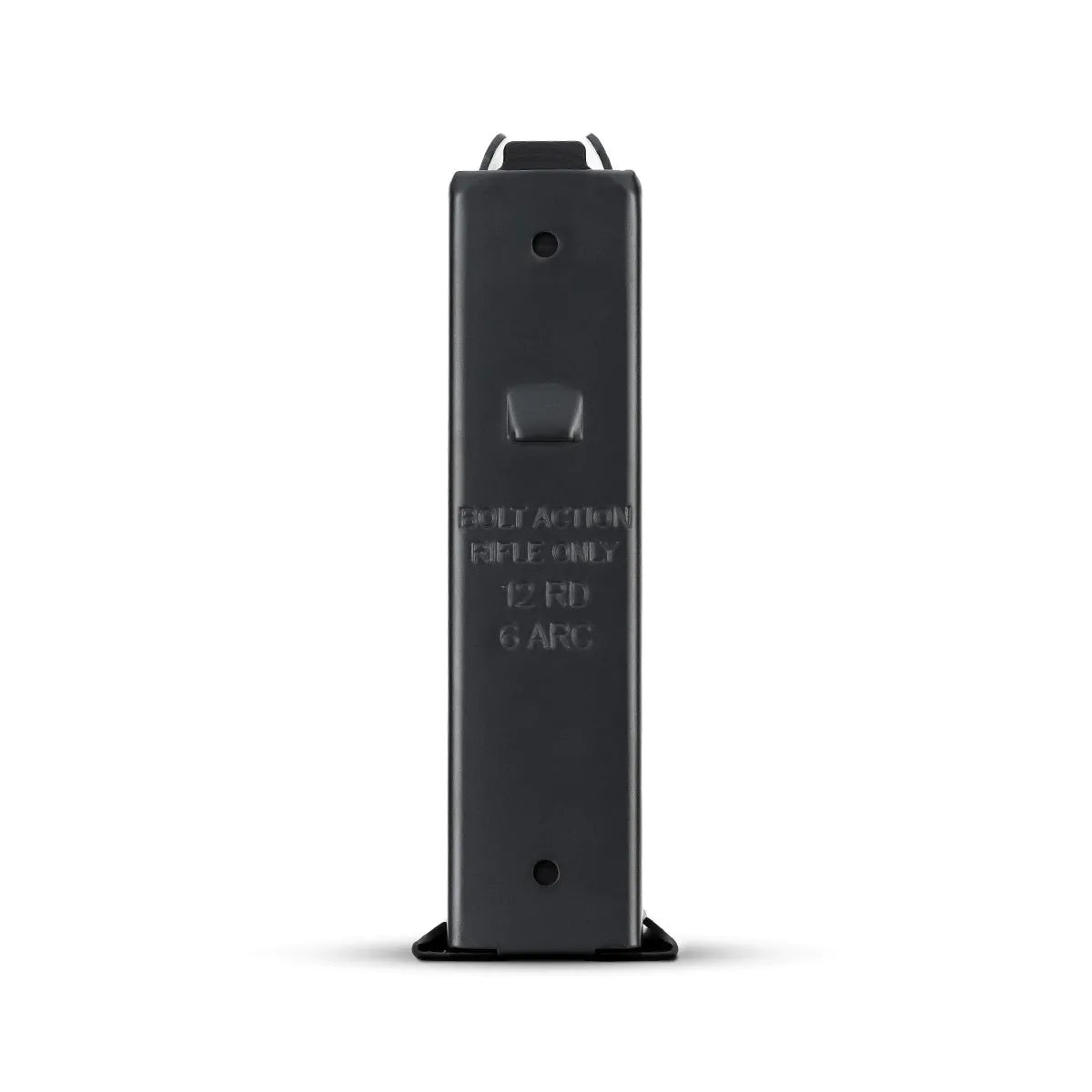 MDT 12-round magazines are approximately ¾” shorter in height than standard AICS 12-round magazines due to MDT’s unique Double Stack to Single Feed (DSSF) transition design, allowing easier mag changes when shooting prone.